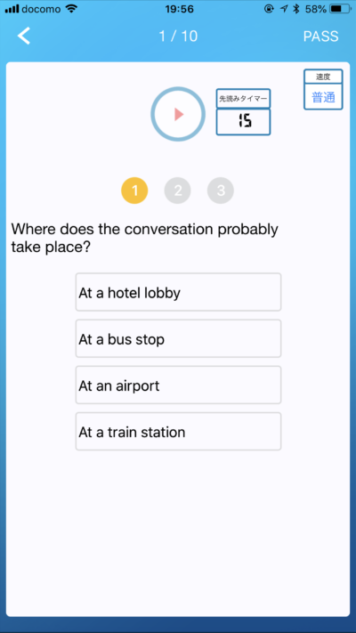 特に、「会話問題」「説明文問題」には、先読みタイマー機能 があり、最初に問題を確認しておくという練習が可能。