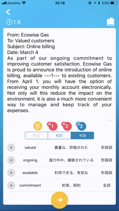 和訳を見ながら答え合わせをし、重要単語は辞書を引くことなく、1タップで確認できるという流れは、まさに、効率を考え抜かれた理想の学習方法!