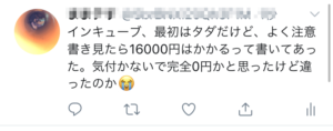 (インキューブ、最初はタダだけど、よく注意書き見たら16000円はかかるって書いてあった。気付かないで完全0円かと思ったけど違ったのか😭)