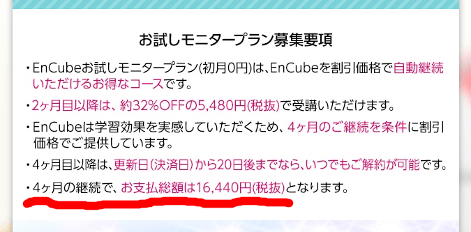 「4ヶ月目以降は解約できる」と明記されていますが、たぶん5ヶ月目以降の間違いですね。4ヶ月目以降だとしたら2回分だけ払えばいいことになるので、総額は10,960円になるはず。