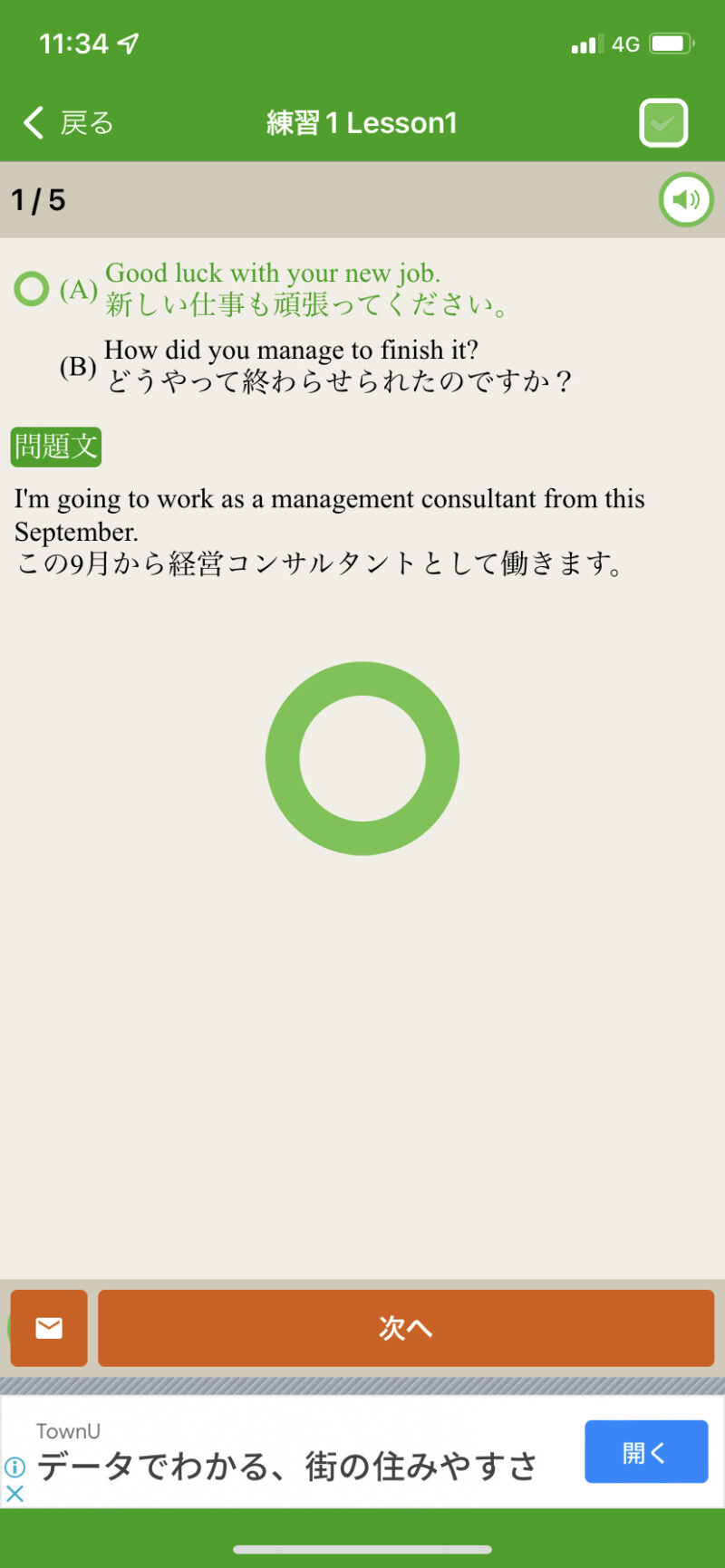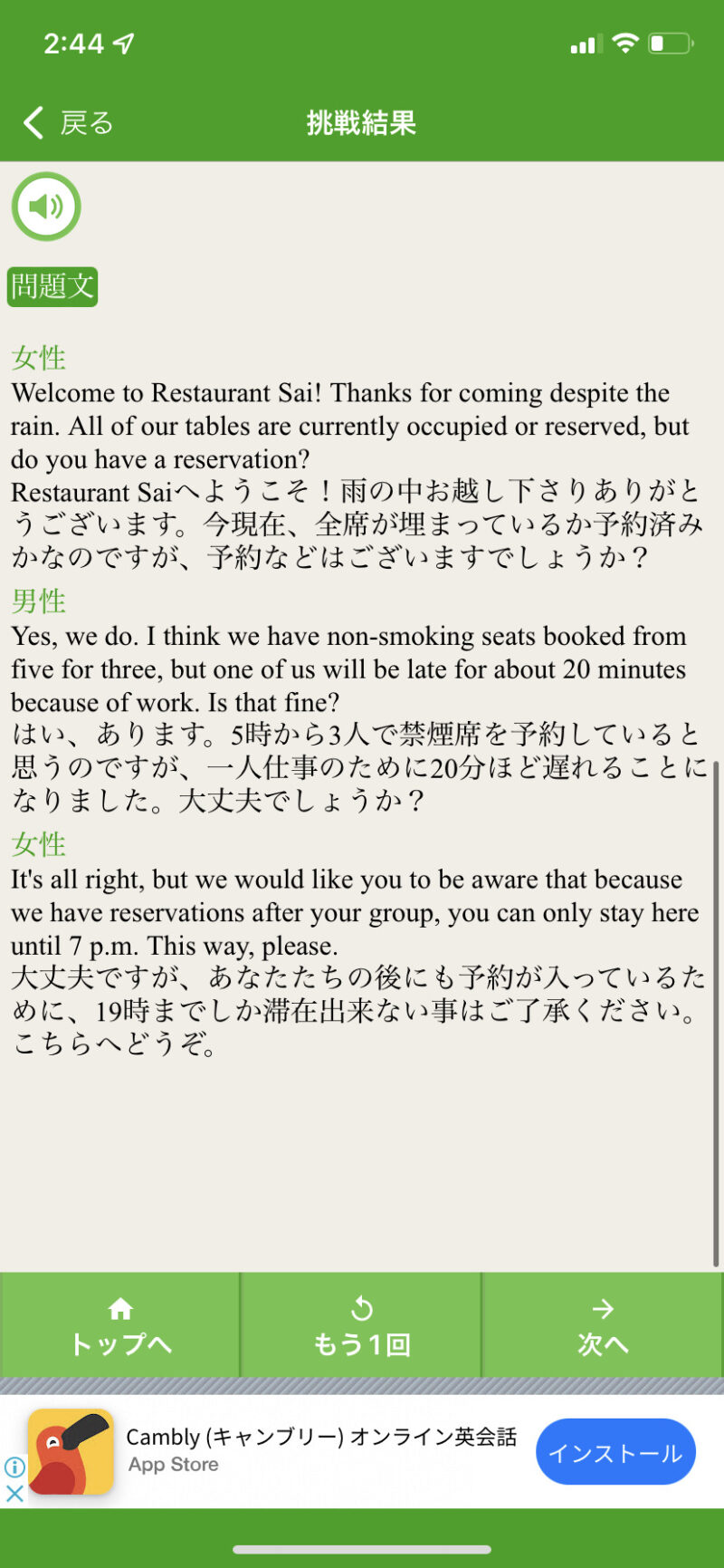 回答後は、テキストの和訳が表示されるという流れ。