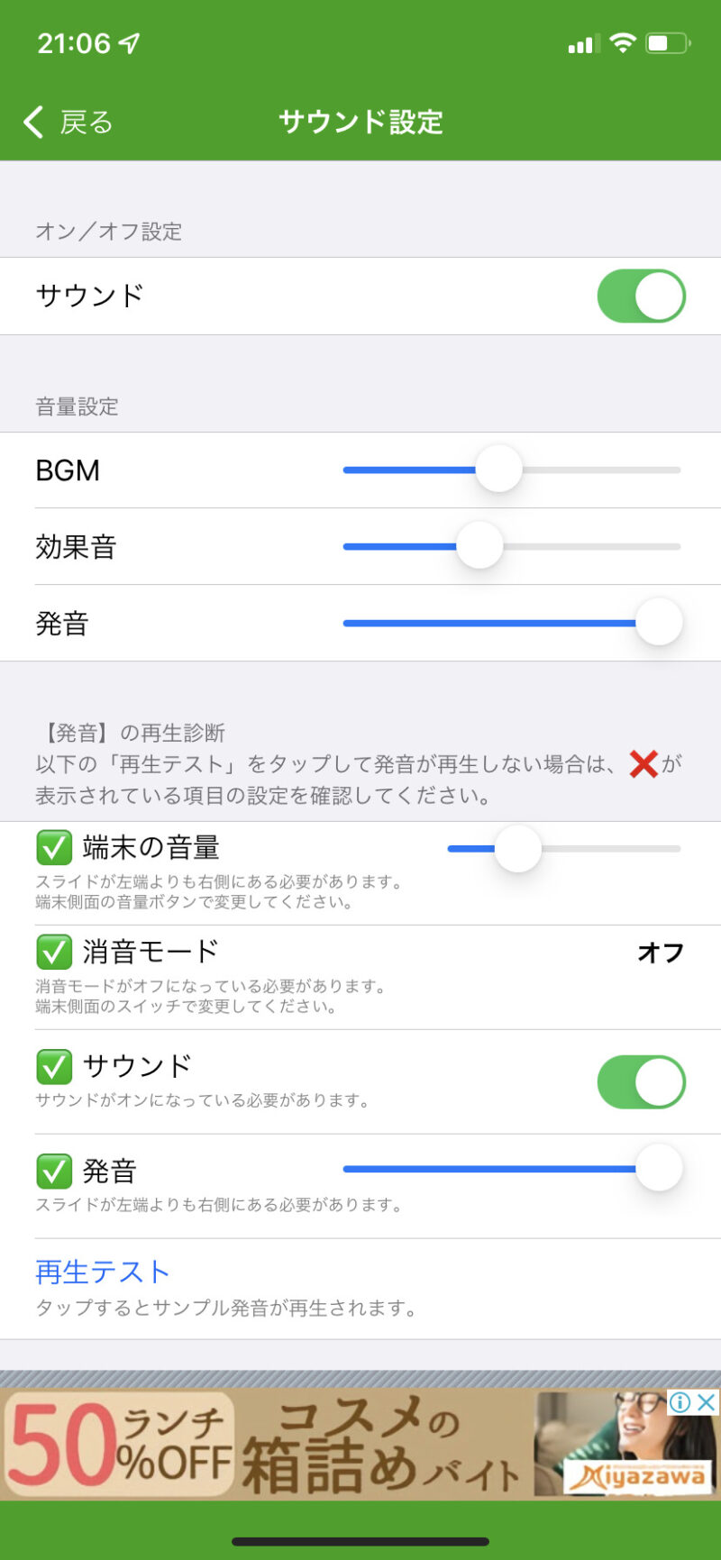 サウンドのオン/オフはもちろん、 BGM ・効果音・発音それぞれの音量を変えることができますよ♪
