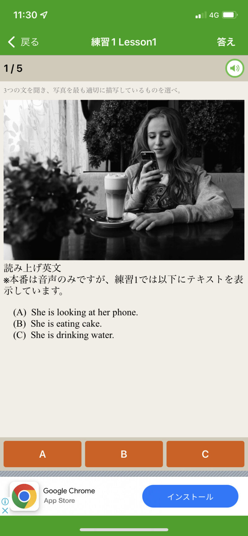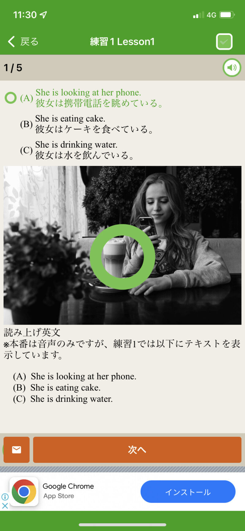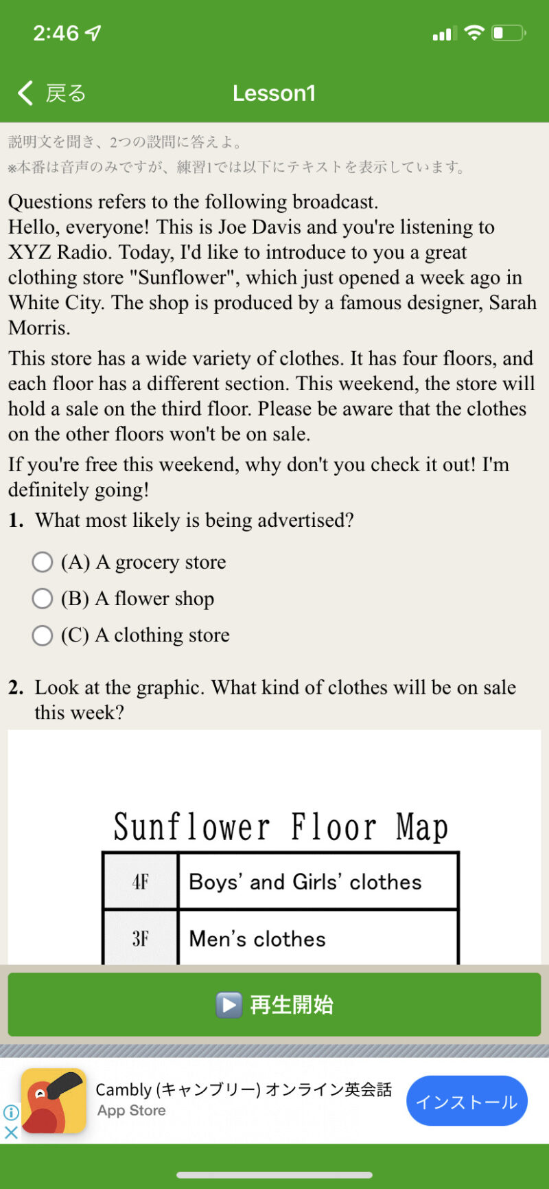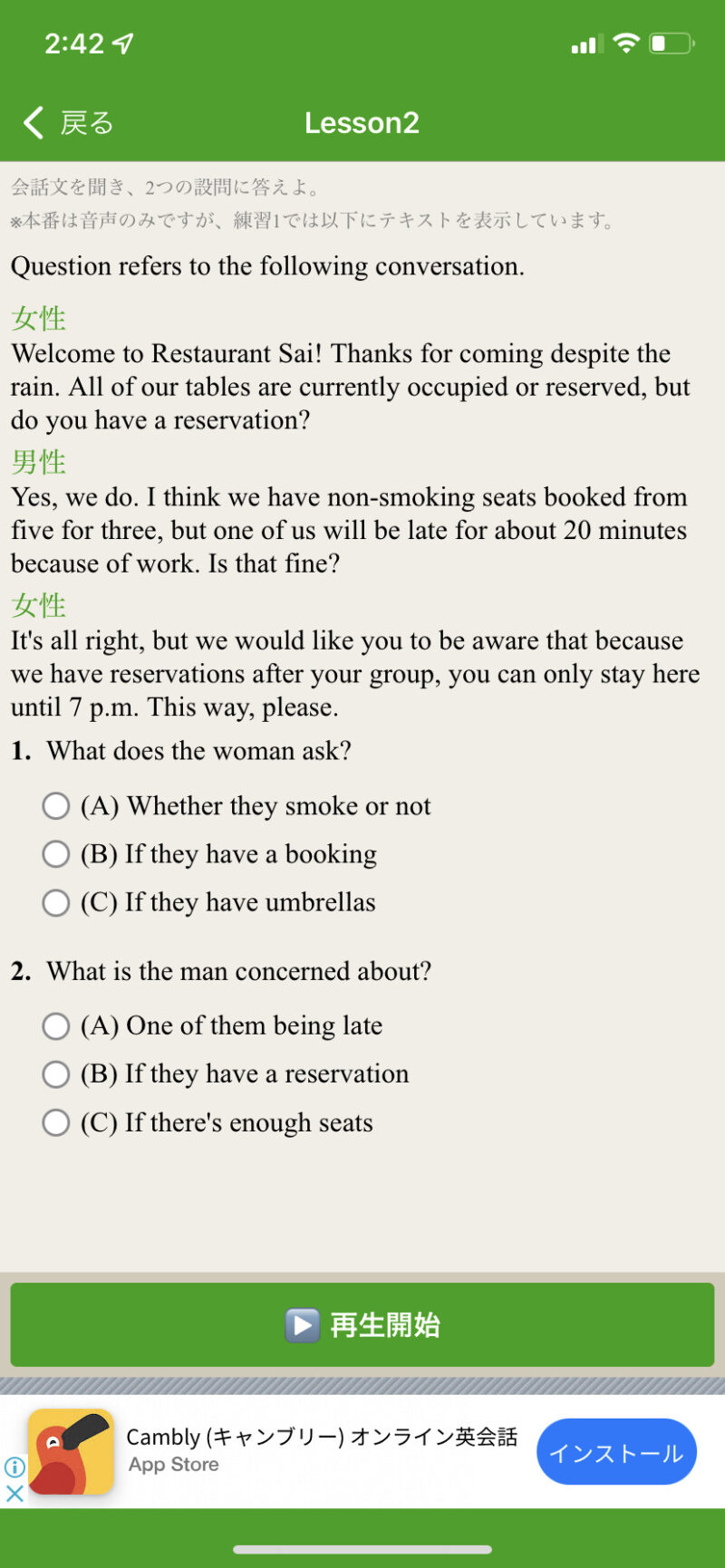 本番は音声のみですが、練習1では、テキストが表示されます。