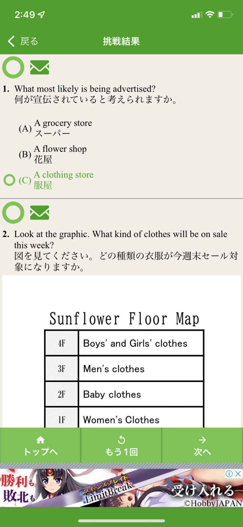 正解でも不正解でも、選択肢の和訳はしっかりと表示されます。