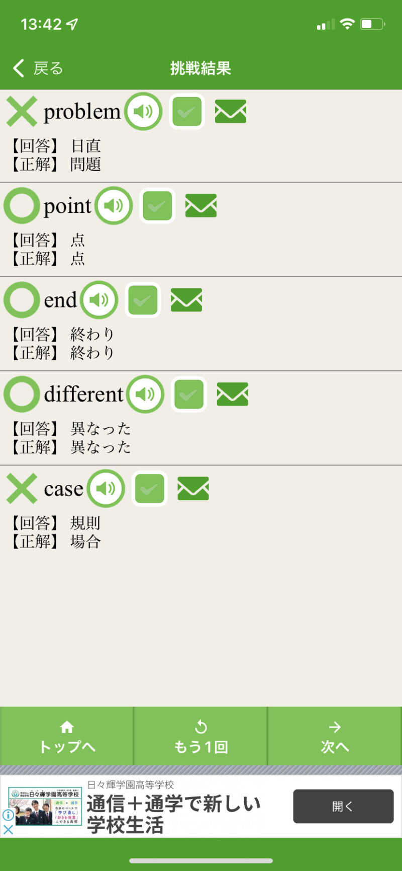 気になる単語や覚えられない単語は、緑の四角にチェック✓を入れておきましょう。