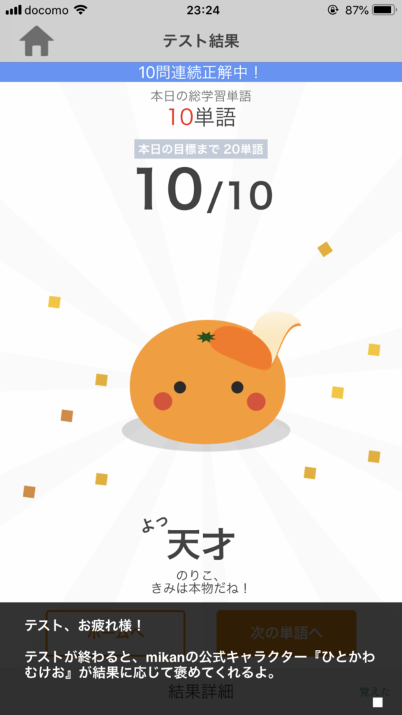 可愛いミカンちゃんが所々に登場するアプリ mikan TOEIC は、いかがでしたか。