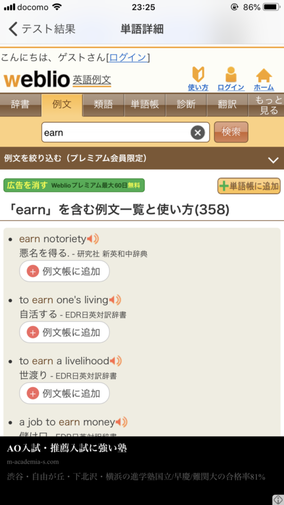 代わりに、オンライン英語辞書サービスであるWebiloの例文ページへとリンクするので、大して問題はなさそうですね。
