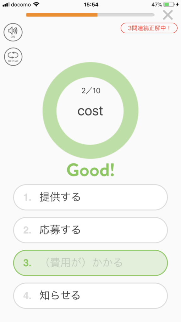 英単語アプリとしては使い勝手が良く、特にTOEIC600点あたりを狙っている方には、本当におすすめです。