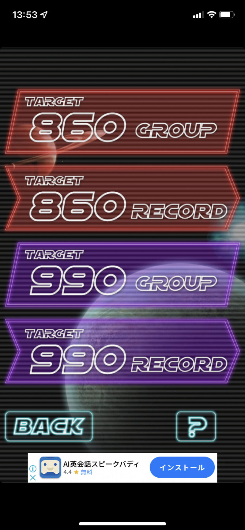 TOEICスコア別に600〜990のステージがあり、各ステージに通常の単語学習モード GROUP と誤答や時間がかかった単語をソートして学習できるモード RECORD があります。