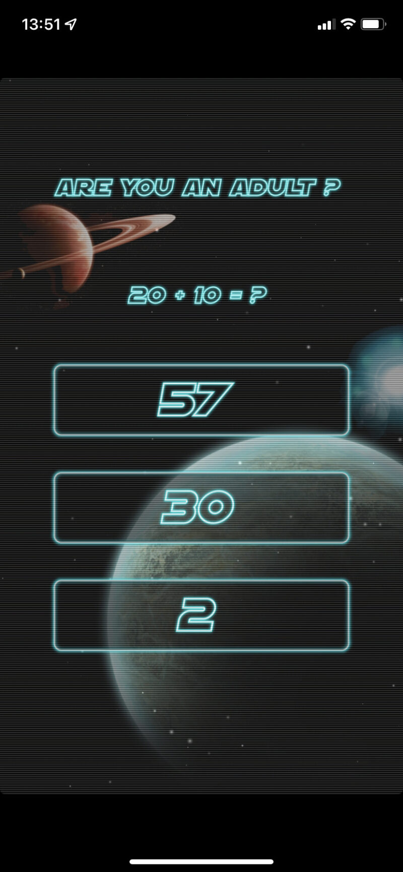 アプリを立ち上げると、Are you an adult?という質問が表示され、簡単な計算問題に答えなければいけません。