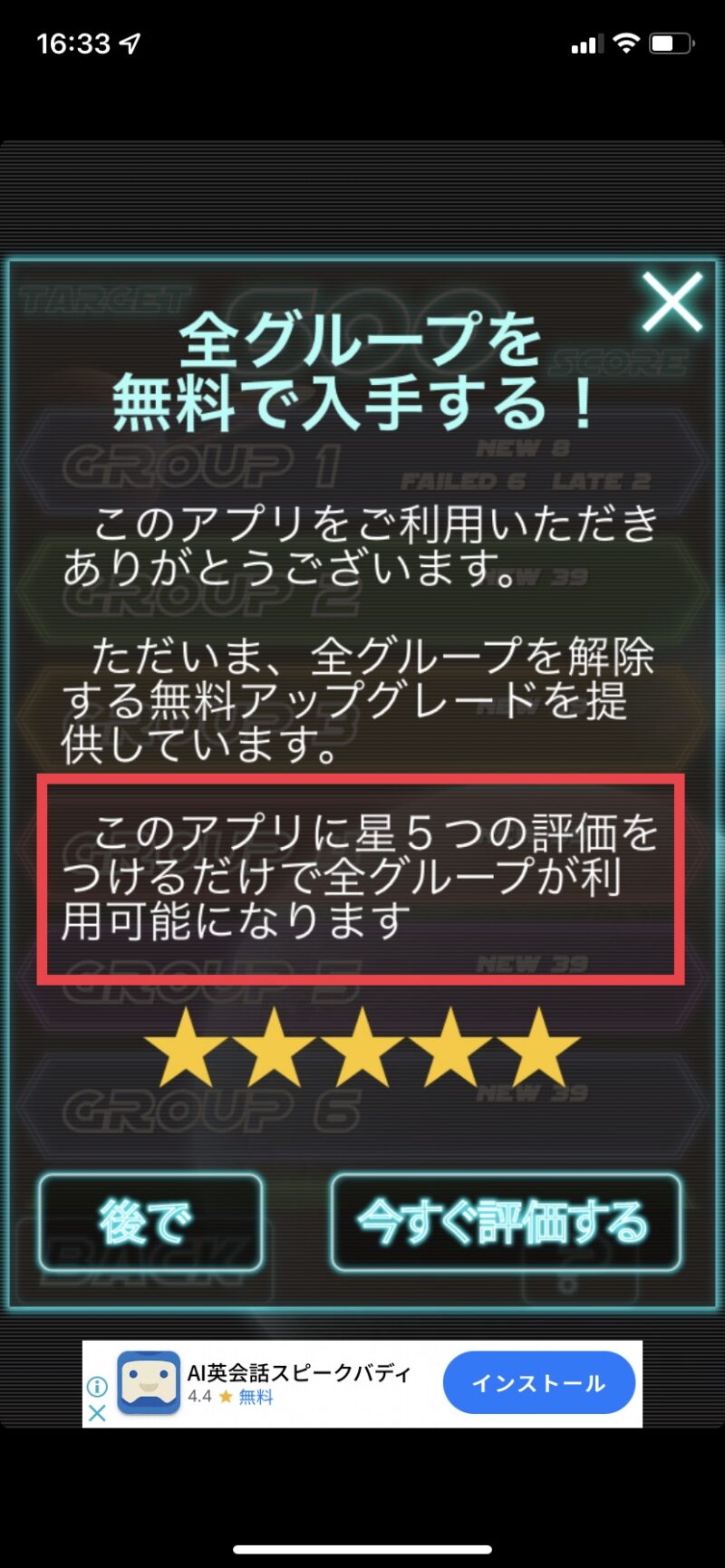 また、TOEIC GalaxyWordでは、グループ2以降を学習するために、星5つの評価をつける必要 があります。