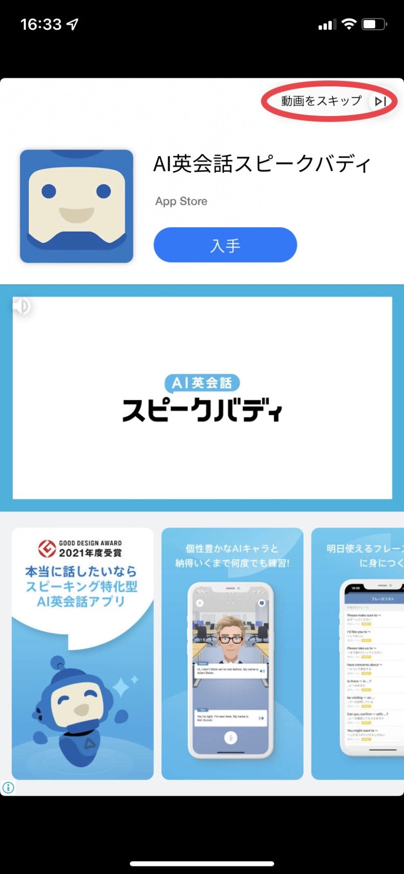 一定時間は待機する必要がありますが、「動画をスキップ」ボタンが表示されたら、迷わずタップして進んでいきましょう。